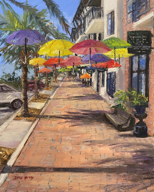 "Artisan Walk" by Shari Gaines. You asked, Local Artist Shari Gaines Listened! The original painting, "Artisan Walk" under the Umbrellas sold...BUT, she now has limited edition prints available! The prints are the same size as the original painting (14"x11") printed on cold press heavy-weight watercolor paper presented beautifully within a 20x16" mat and comes with a certificate of authenticity. This piece will fit perfectly in a 20"x16" frame.