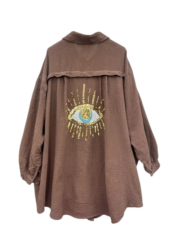 Ward off bad energy in effortless style. This oversized Evil Eye shirt doubles as a breezy cover-up, perfect for beach days, lounging, or layering with denim. Featuring the iconic Evil Eye motif for protection and good fortune, it brings together comfort, symbolism, and trend-forward design.