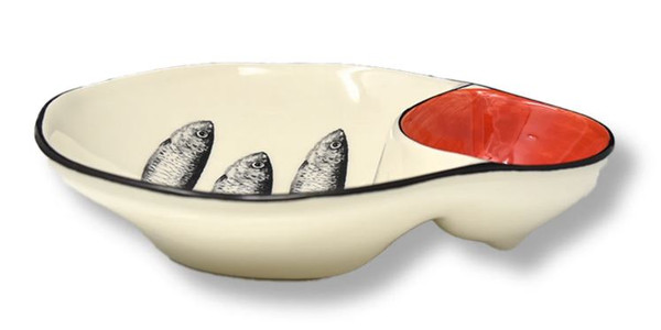 Add some Portuguese flair to your kitchen and table with this ceramic Sardinha olive dish from Alcoa Arte. This collection is Inspired by sardines, a Portuguese favourite. This dish has two compartments which makes it perfect for serving olives. Hand crafted with hand painted finishes means each piece may vary and is distinctive and unique.Food safe, led free, microwave and dishwasher safe.Made in Portugal. Color may vary.