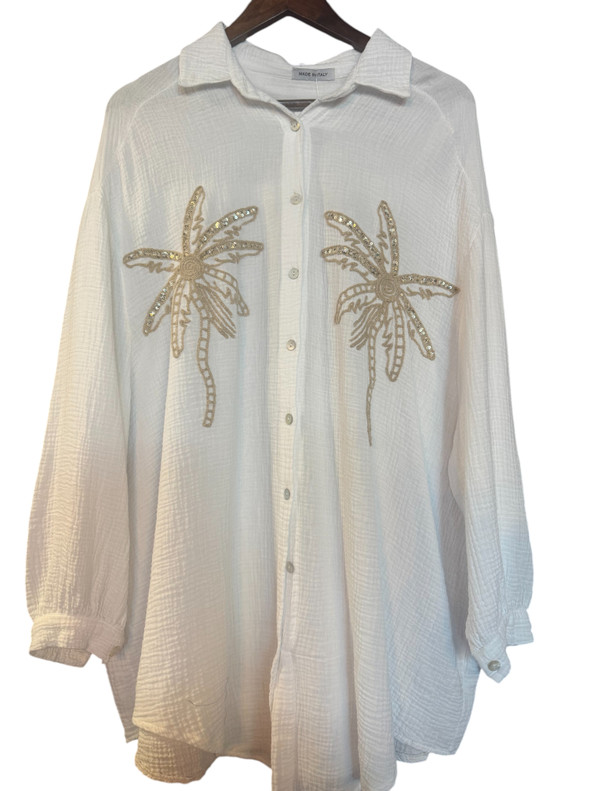 Breezy and effortless, this oversized shirt features a relaxed fit and soft, lightweight fabric for all-day comfort. The playful palm tree design on the front adds a touch of coastal charm—perfect as a casual top, beach cover-up, or layered statement piece. One-size styling makes it easy to wear and versatile for any wardrobe.